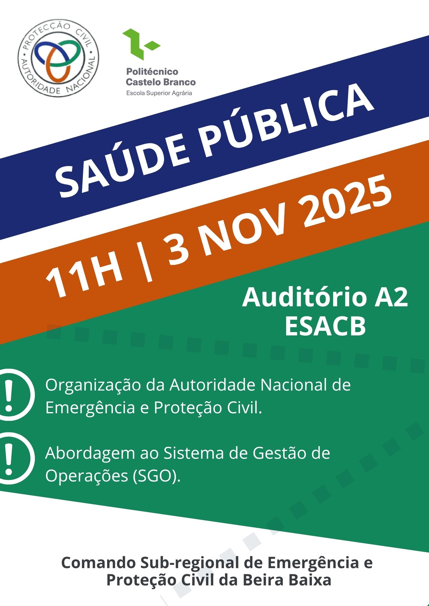No próximo dia 3 de novembro, a Escola Superior Agrária de Castelo Branco, contará com a representação do Comando Sub-regional de Emergência e Proteção Civil da Beira Baixa para apresentação e esclarecimento da importância deste setor na Saúde Pública.
