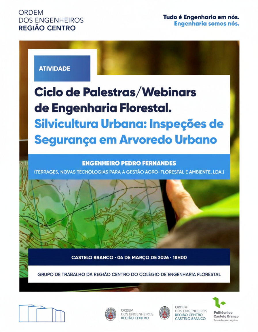 O Grupo de Trabalho da Região Centro do Colégio de Engenharia Florestal promove, no próximo dia 4 de março, às 18:00h, a primeira de sete palestras do Ciclo de Palestras/Webinars de Engenharia Florestal, que terão lugar na Escola Superior Agrária do Instituto Politécnico de Castelo Branco, em formato híbrido (presencial + online)