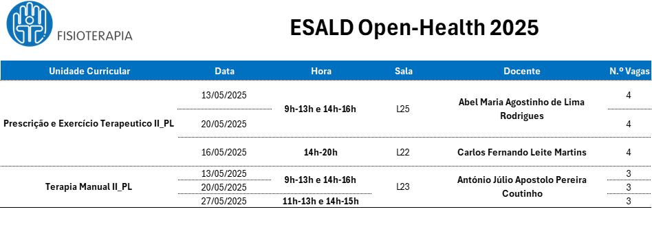 A ESALD Open Health é um programa implementado desde abril de 2019, que propõe a toda a comunidade estudantil conhecer a oferta formativa e as instalações da Escola Superior de Saúde Dr. Lopes Dias. Constitui-se como uma enorme mais-valia, pois permite que os interessados possam participar e desenvolver atividades com a ESALD nos vários cursos aqui lecionados.