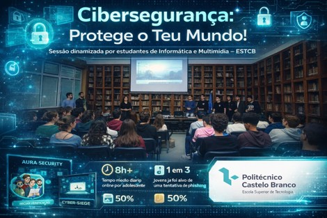 Estudantes da licenciatura em Informática e Multimédia da Escola Superior de Tecnologia do IPCB dinamizaram uma sessão de sensibilização dedicada ao tema da cibersegurança, na Biblioteca Egas Moniz da Escola Secundária Nuno Álvares (ESNA), em Castelo Branco.