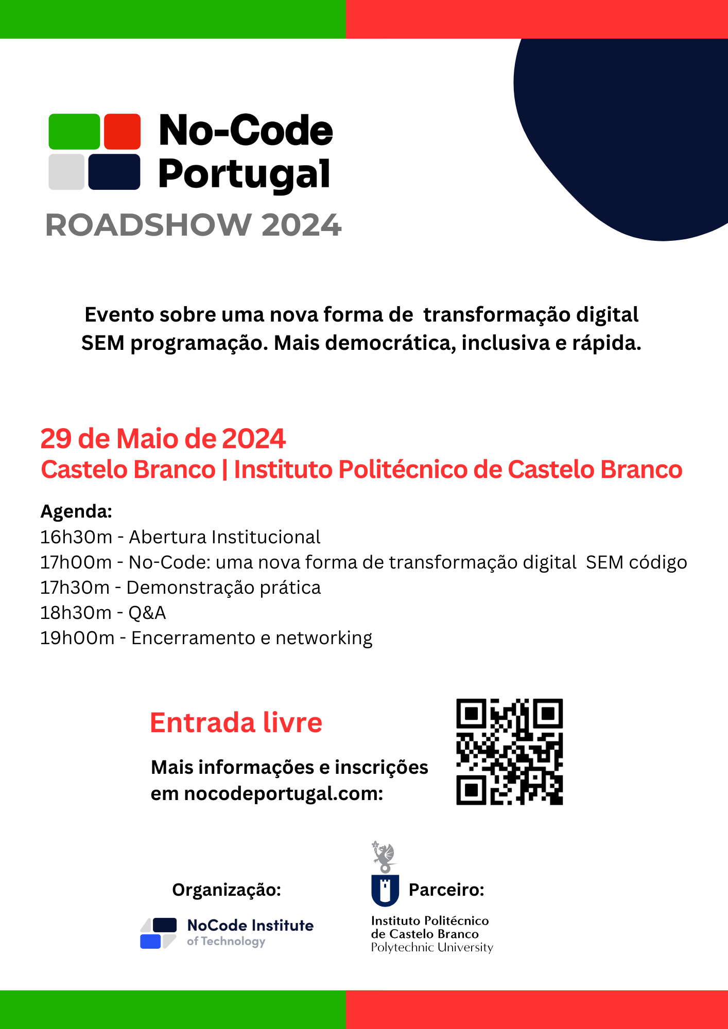 O Instituto Politécnico de Castelo Branco recebe, a 29 de maio, pelas 16h30, o Roadshow No-Code Portugal 2024.