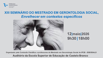 No dia 12 de maio de 2026, vai realizar-se, no Auditório da Escola Superior de Educação do IPCB, com início às 9:30h, o XIII Seminário do Mestrado em Gerontologia Social, Envelhecer em contextos específicos, organizado pela Comissão Científica e professores do Mestrado em Gerontologia Social do IPCB/ESE-ESALD.