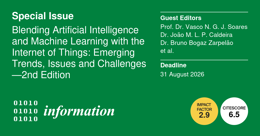 Vasco Soares, João Caldeira e Adriano Raposo, docentes do IPCB e investigadores do Instituto de Telecomunicações, são editores convidados da 2ª edição de um número especial da revista científica internacional Information (ISSN 2078-2489), dedicado ao tema “Blending Artificial Intelligence and Machine Learning with the Internet of Things: Emerging Trends, Issues and Challenges”. A equipa de editores inclui também o Prof. Dr. Bruno Zarpelão da Universidade Estadual de Londrina, Paraná, Brasil, e o Prof. Dr. Manuel Jesus-Azabal da School of Information Engineering, Wenzhou Business College, China.