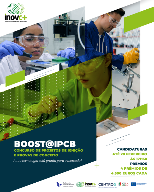 O "Boost@IPCB – Concurso de Projetos de Ignição e Provas de Conceito”, enquadra-se nas ações do projeto INOVC+: Ecossistema de Inovação para a Transferência de Conhecimento e Tecnologia da Região Centro, cofinanciado pelo Portugal 2030, através do programa operacional Centro 2030 e pela União Europeia. Este projeto, tem como missão conceber um sistema articulado entre ciência, tecnologia e o mundo empresarial, contribuindo para o posicionamento da Região Centro como uma referência nacional dos domínios de inovação, tecnologia e empreendedorismo.